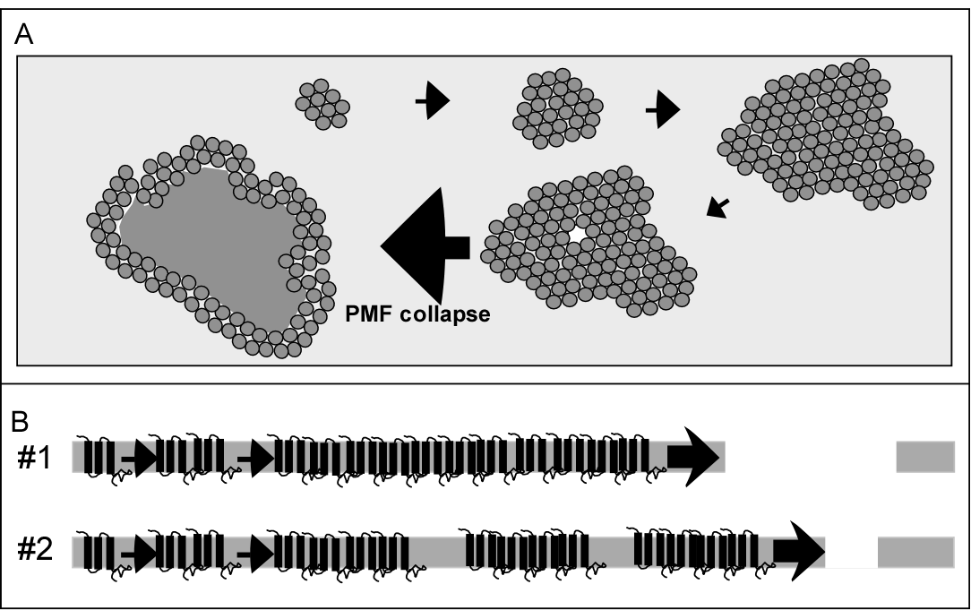 Figure 10-8: The “death raft” model for holin function.   A.  Holin rafts.  It is proposed that holins accumulate in rafts in the membrane, shown here in a schematic top-down view, and that intimate intermolecular and intramolecular helix-packing between the TMDs of the holins largely excludes lipids.  Each circle represents a single holin molecule.  Spontaneous formation of an aqueous channel by thermal fluctuation is depicted.  The localized depolarization causes a conformational change in the holins leading to asymmetric disruption of the helix packing, exposure of a relatively hydrophilic surface, and dispersion of the subunits into the holin lesion.  B.  “Hole” size.  Based on the raft model above, a rationale for the formation of different-sized lesions by holins, depicted in a cross-sectional schematic of the membrane.  Large lesions would be formed by the triggering of the large rafts of holin #1, whereas smaller lesions are formed in #2, which could represent a mutant of holin #1 or a heterologous holin that normally functions with a sec-exported endolysin and thus is not required to form a large lesion to allow endolysin release.  Adapted from Wang et al. (110), with permission.