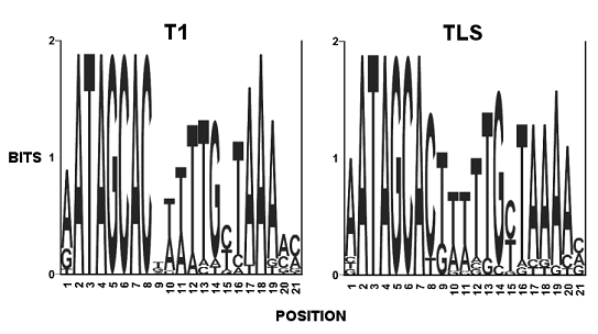 Figure 17-3: Consensus sequence logos of the T1 and TLS 21 nt direct repeats produced using WebLogo (http://www.bio.cam.ac.uk/cgi-bin/seqlogo/logo.cgi).