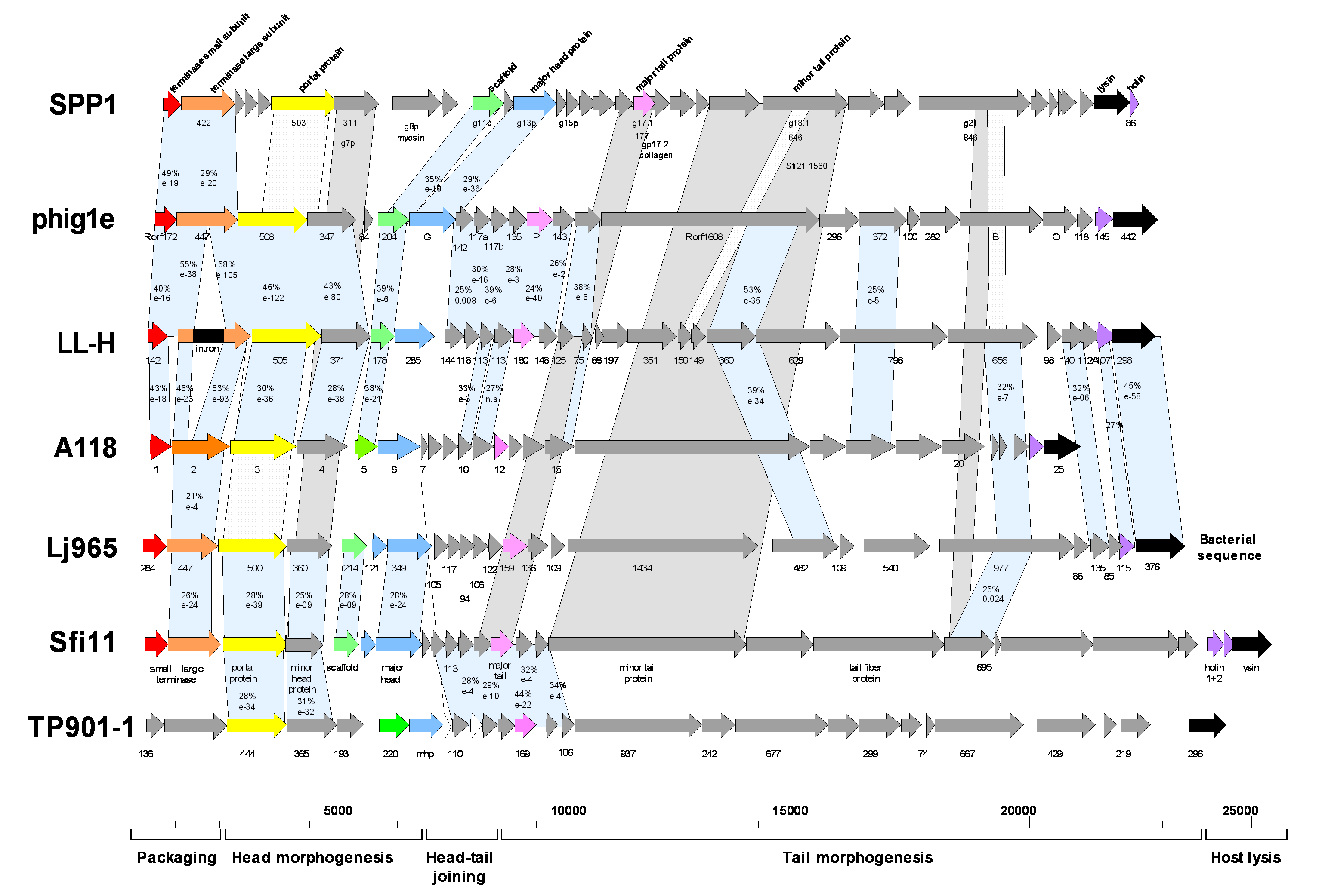 Figure 41-2: Comparative genome maps of selected Lactobacillus phages. A. Alignments of the genetic maps from the temperate cos-site Streptococcus thermophilus phage Sfi21, L. casei phage A2 and Staphylococcus aureus phage PVL. The ORFs are color coded according to their predicted functions starting with the DNA packaging and head genes (green) at the left, followed by head-to-tail (brown), tail (dark blue), tail fiber (light blue),  lysis (violet), candidate lysogenic conversion (black), lysogeny (red), DNA replication (orange) and transcriptional regulation genes (yellow). Unattributed genes appear as grey arrows. Genes sharing significant sequence identity at the protein level are linked by grey shading; the bold figures indicate degree of aa identity in %. B. Alignment of the late gene cluster from pac-site Siphoviridae from Bacillus subtilis phage SPP1, L. plantarum phage phig1e, L. delbrueckii phage LL-H, Listeria monocytogenes phage A118, L. johnsonii prophage Lj965, Streptococcus thermophilus phage Sfi11 and Lactococcus lactis phage TP901-1. Selected genes are color-coded: small subunit terminase (red), large subunit terminase (orange), portal (yellow), scaffold (green), major head (blue), major tail (violet), holin (mauve) and lysin gene (black). Genes sharing significant sequence identity at the protein level are linked by blue (neighbors) or grey shading; the percentages correspond to aa identity and E-value.
