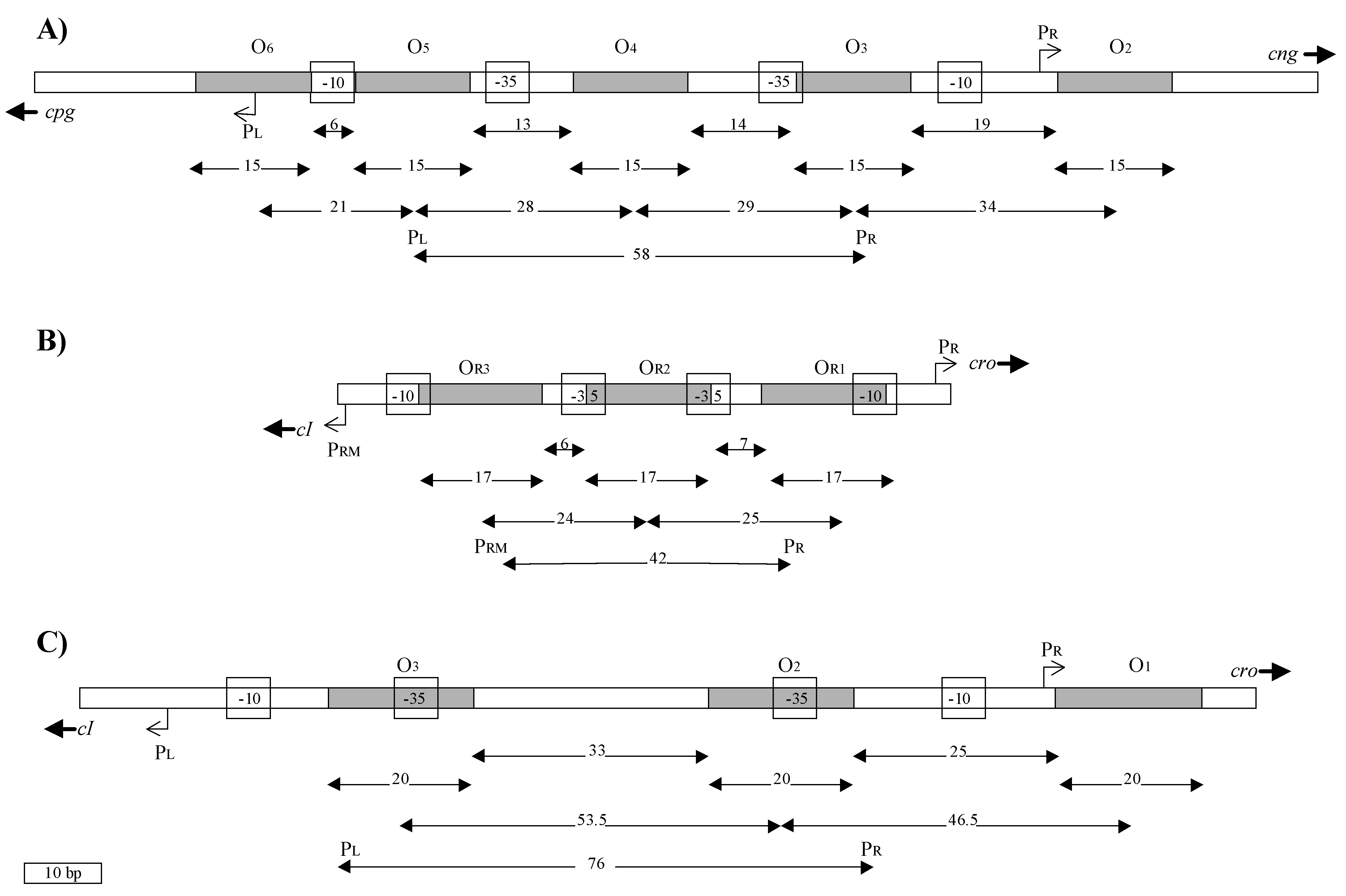 Figure 41-3: Comparison of the genetic switch regions of bacteriophages g1e (A), lambda (B) and A2 (C) (drawn to scale). The operator sequences (O(1) to O(6)) are enclosed in shaded boxes. The –10 and –35 promoter consensus regions are indicated by open boxes. The transcription start sites of the divergently oriented promoters are signaled by bent arrows. The numbers within the double headed arrows indicate the lengths (in bp) of the relevant features as follows (from top to bottom): distance between operator sequences, operators, segment from center to center of contiguous operators, stretch between the centers of the P(L) and P(R) promoters; note especially the difference in the size of the segments located between the operator sites and the total length of the P(L) – P(R) intervening sequence. In the case of g1e another operator sequence was detected 3’ of each cpg and cng (which are the functional equivalents to cI and cro respectively).