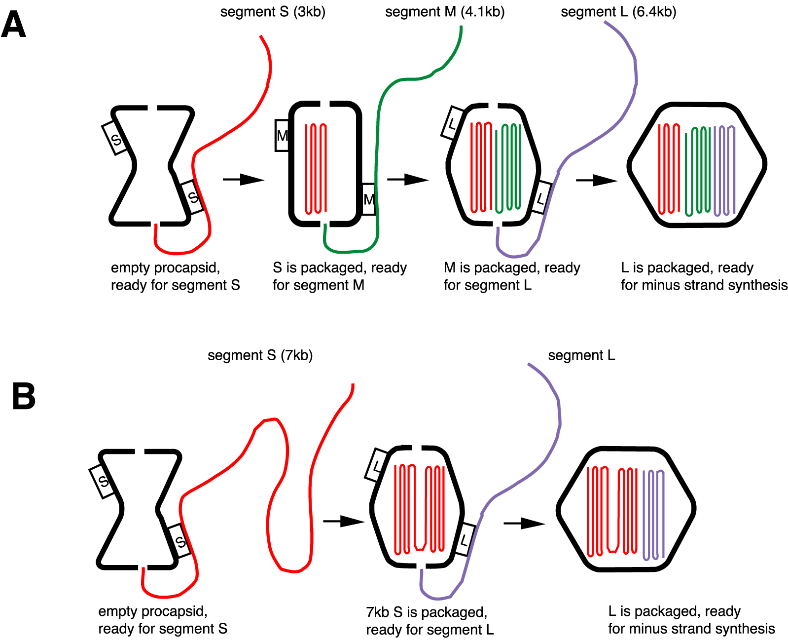 Figure 16-6: (A)  The packaging model.  The empty procapsid shows only binding sites for s.  After a full size s is packaged, the s sites disappear and m sites appear.  After a full size m is packaged, the m sites disappear and l sites appear.  After a full size l is packaged, minus strand synthesis commences.  After minus strand synthesis is completed, plus strand synthesis commences.  (B)  If segment s is of the size equal to the sum of both s and m, the s sites will disappear and the l sites will appear and segment l will be packaged without segment m.