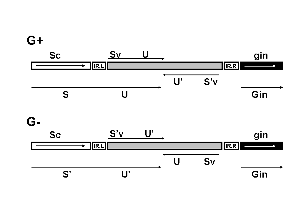Figure 30-7: G-region inversion. The alternative expression of S U and S’U’ genes, due to the programmed inversion of the 3 kb DNA segment between the IR sites, allows the synthesis of an alternative set of tail fibers proteins.  The S gene of bacteriophage Mu is formed by a Sc sequence common for both S and S’ genes, localized before the IR.L site, and a variable portion Sv or S’v, localized within the invertible G-region and followed by the U and U’ genes, respectively.