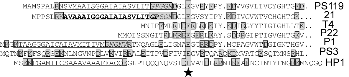 Figure 10-6: Signal arrest domains in endolysins of Gram-negative bacteria.  The predicted N-terminal sequence of the endolysins of the lambdoid phages 21 (24), PS119 (Genbank accession CAA09710), P22 (32), and PS3 (Genbank accession CAA09701)  and the non-lambdoid phages P1 (32),  T4 (82), and HP1(8) are shown, with acidic and basic residues highlighted by shaded boxes.  The predicted N-terminal signal arrest domain is boxed in some of the endolysin sequences.  In each case, a glycine-proline rich domain, highlighted by italics and shading, separates the signal arrest domain from the rest of the protein sequence.  The star indicates the conserved glutamate involved in catalysis in the T4 endolysin (88).