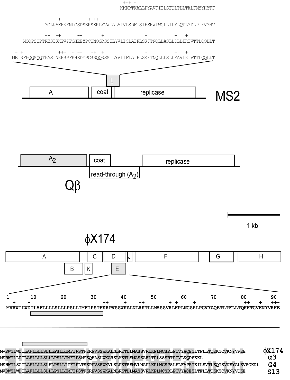 Figure 10-9: Single-gene lysis systems in ssDNA and ssRNA phages.  Lysis genes are shaded.  Top:  Map of MS2, the prototype group I ssRNA phage, with the L sequence displayed above the map.  L sequences from the  group I  phage fr (4), the group II phage GA (62), and the Acinetobacter phage AP205 (70) are arrayed above MS2 L for comparison.  Middle: Map of Qbeta, the prototype group III ssRNA phage (106).  The regions of close sequence similarity between Qbeta A2 and MS2 A are hatched, and the locations of the por mutations, selected for plaque-formation on a rat host, are indicated by stars (15) (I.-N. Wang and R. Young, unpublished).  Bottom:  Map of  the single-stranded circular DNA phage phiX174, shown linearized at the start of the A gene.  The sequence of the E lysis protein is displayed below the map, along with an alignment of the ortholog E proteins from the related phages (top to bottom) G4, alpha3 and S13 (48, 122).